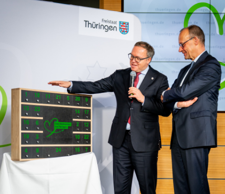 Zum Abschluss seines Antrittsbesuchs erhielt Bundeskanzler Friedrich Merz noch ein ganz besonderes Geschenk aus dem Grünen Herzen Deutschlands: Ministerpräsident Mario Voigt überreichte einen Adventskalender – gefertigt aus Thüringer Eiche von einem Thüringer Handwerksbetrieb.