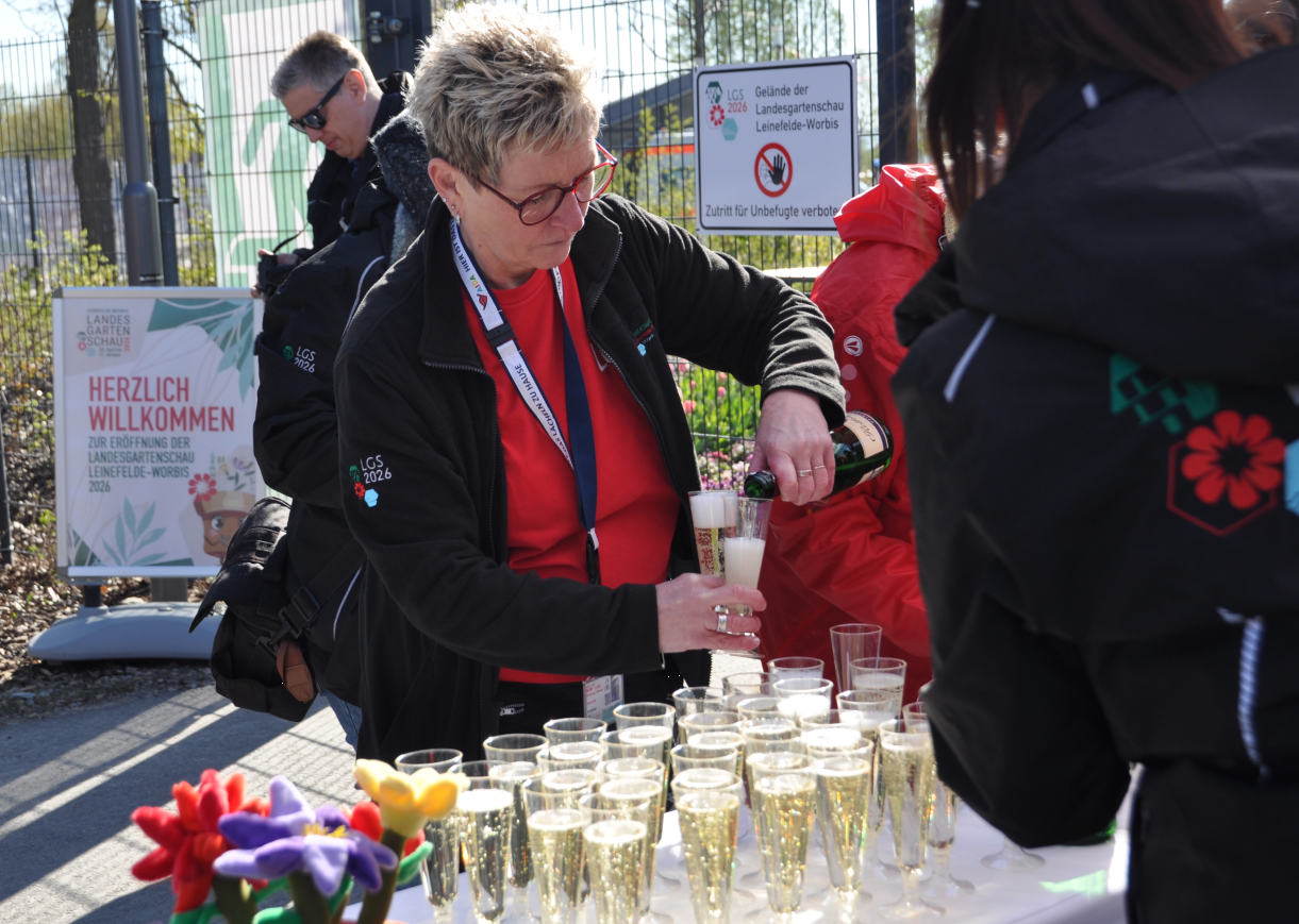 Für die ersten 100 Besucher gab es Sekt oder Orangensaft. Auch Daniela Preiß vom Landesgartenschauteam half beim Einschenken. Foto: Ilka Kühn