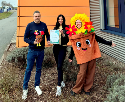 Daniel Simon von der Orlob GmbH mit einer handlichen Version des Maskottchens. Er bekam von LGS-Mitarbeiterin Anna Brandt die Sponsorenurkunde überreicht. Das Kostüm durfte Lea Schenk zum ersten Mal ausprobieren.