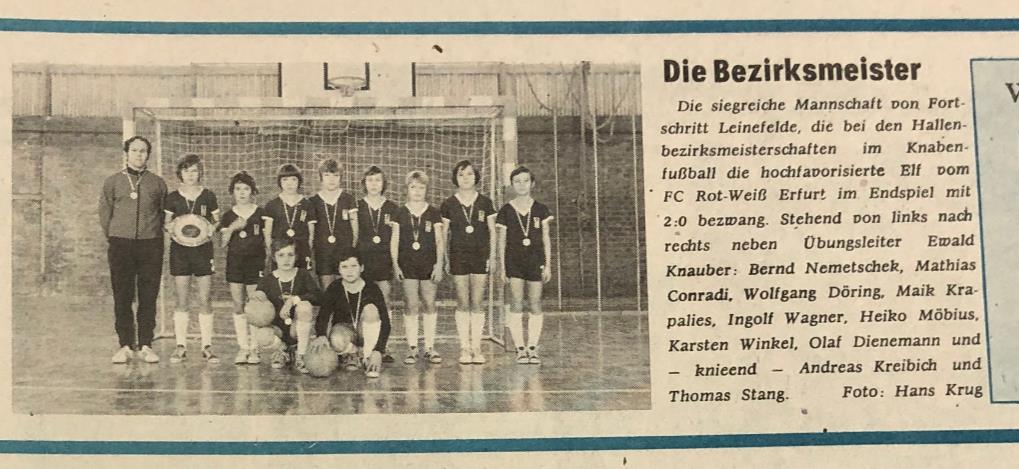 Im März 1974 wurde in der damaligen Worbiser Ausgabe von „Das Volk“ dieses Foto gezeigt mit dem Hinweis, dass die Leinefelder den Favoriten Rot-Weiß-Erfurt besiegt hatten und Hallenbezirksmeister wurden. Archiv: Ilka Kühn