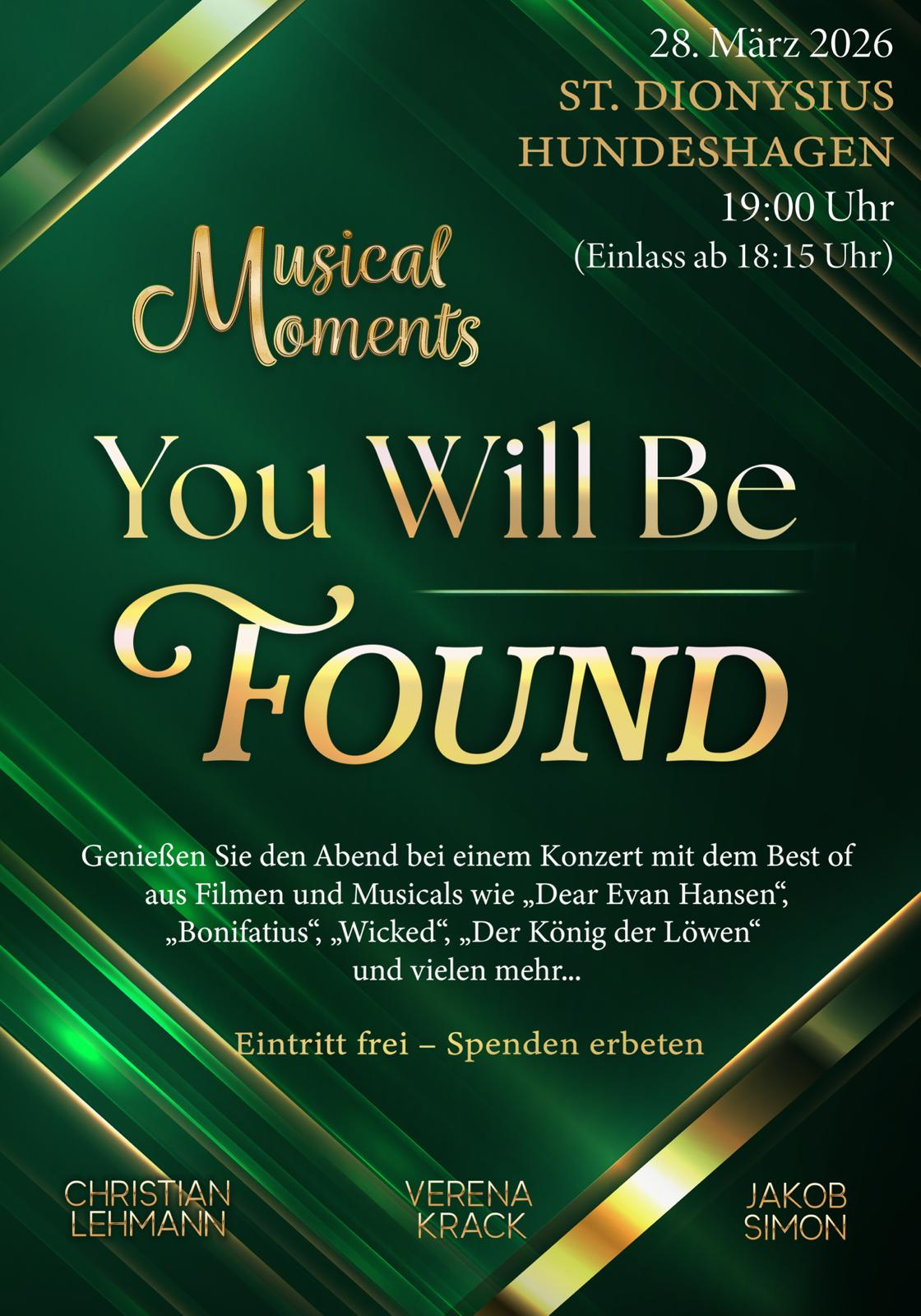 Am Samstag, 28.03.2026, findet um 19.00 Uhr in der katholischen Kirche St. Dionysius im Musikantendorf Hundeshagen ein Musicalkonzert mit dem Thema „You will be found“ statt.