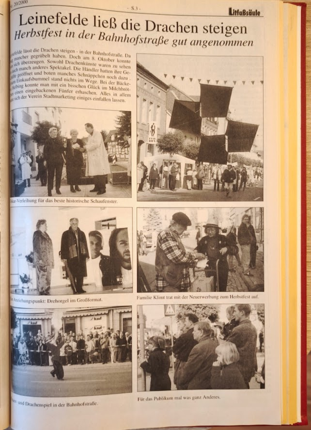 Ich habe mal in meinen alten Litfaßsäulen geblättert und diese Seite mit dem Herbstfest von 2000 gefunden. Da war die Bahnhofstraße noch belebt und es konnten noch Attraktionen herangeholt werden, wie diese Drachenkünstler.
