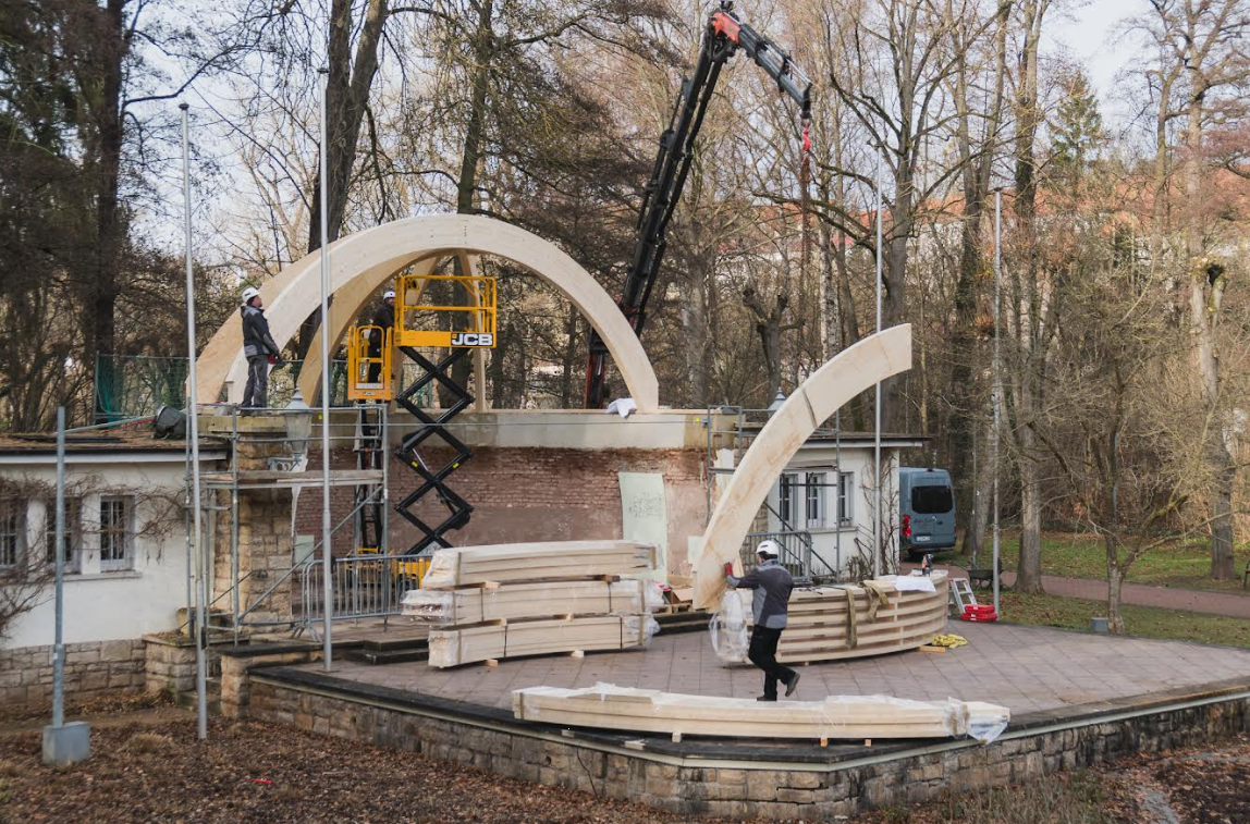 Heilbad Heiligenstadt. Die Arbeiten an der Konzertmuschel im Heinrich-Heine-Kurpark kommen weiter voran. Das neue Holztragwerk wird derzeit mit Furnierschichtholz- und