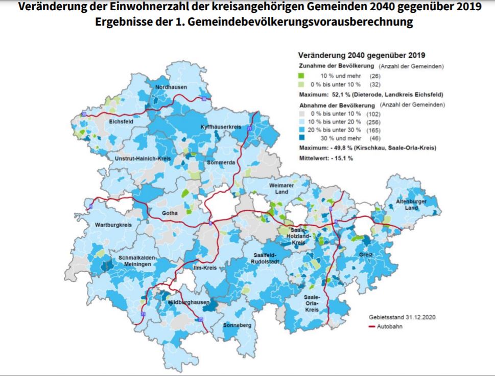 Einwohnerrückgang und Alterung werden auch in den nächsten 20 Jahren die wesentlichen Charakteristika der Bevölkerungsentwicklung in Thüringen sein – jedoch nicht in allen Gemeinden gleichermaßen. Für 58 bzw. 9,3 Prozent aller kreisangehörigen Gemeinden werden für 2040 gegenüber der Einwohnerzahl 2019 Bevölkerungsgewinne erwartet. Zu diesem Ergebnis kommt eine Auswertung des Thüringer Landesamtes für Statistik (TLS) zur 1.
