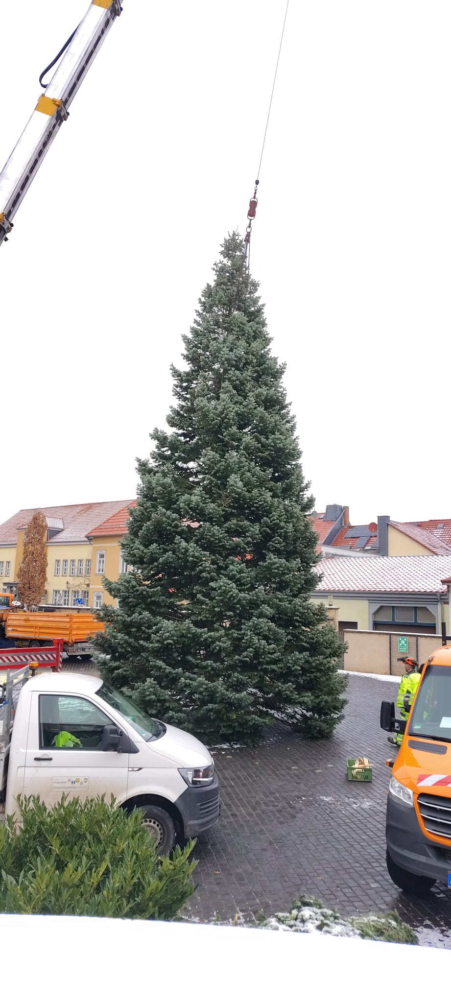 Die Zahlen sprechen für sich: 12 Meter Höhe, 2,6 Tonnen Gewicht – eine Colorado-Tanne, die schon beim Transport besonderes Fingerspitzengefühl verlangte. Damit hat Dingelstädt einen Weihnachtsbaum-Rekord auf dem Rathaushof aufgestellt, bestätigt der Bauhof.